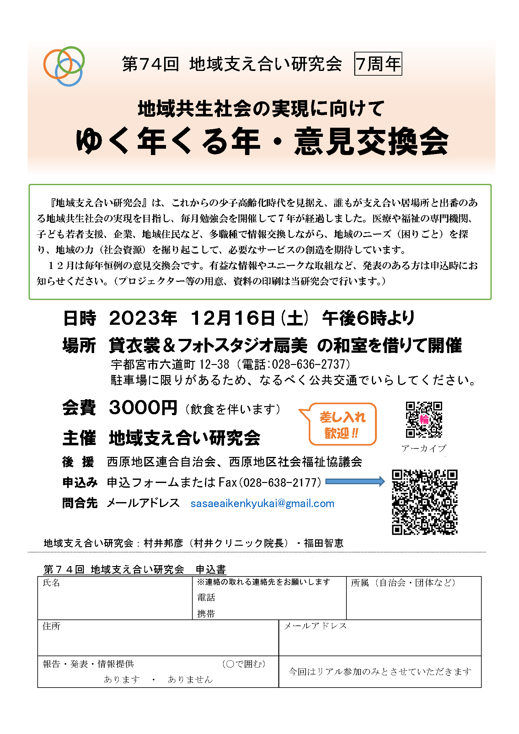 第74回地域支え合い研究会『~地域共生社会の実現に向けて~ゆく年くる年・意見交換会』(要申込)
